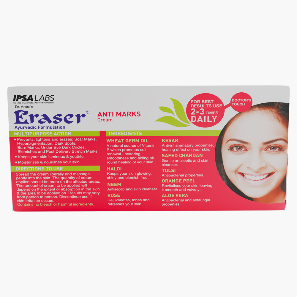 Eraser Ayurvedic Anti Marks Cream offers a potent, natural solution to lighten and fade all types of skin marks—hyperpigmentation, dark spots, scars, burn marks, under-eye circles, and more—within just few days of regular use. Crafted with a powerful blend of Ayurvedic ingredients like Wheat Germ Oil, Neem, Safed Chandan, Aloe Vera, and Kesar, this cream nourishes deeply, promotes collagen regeneration, and helps heal and diminish marks. The brightening properties of Haldi, Rose Flower, and Orange Peel work together to even skin tone and reduce imperfections, leaving you with a radiant, blemish-free complexion.